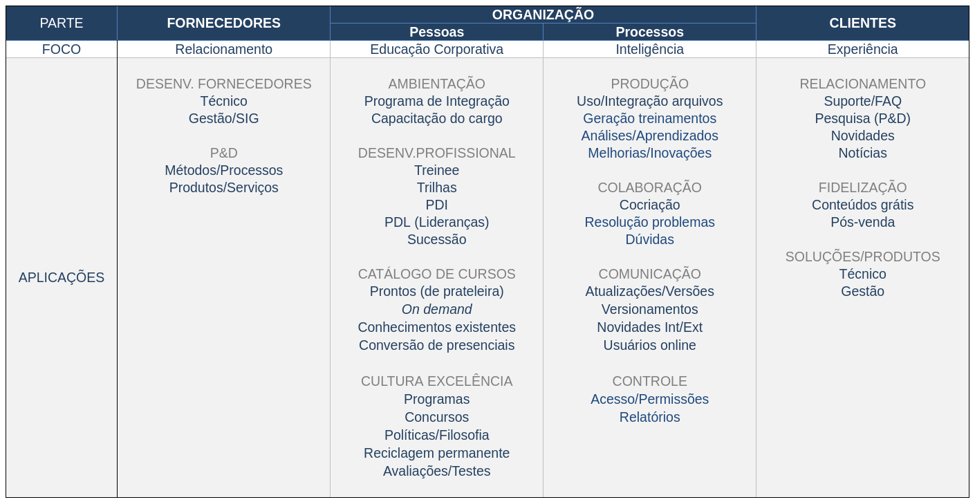 A plataforma é permanentemente atualizada para atender as novas e crescentes demandas impostas pelo mercado em campos como comportamentos, gestão e tecnologia, servindo tanto para a GESTÃO DO CONHECIMENTO do público interno quanto externo. Veja a seguir algumas aplicações possíveis:
